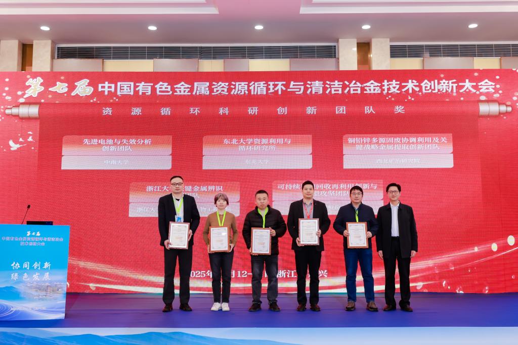 会议还对有色金属资源循环行业作出贡献的青年科技工作者、优秀团队和杰出企业进行了表彰。研究院“先进电池与失效分析创新团队”荣获“资源循环科研创新团队奖”,范鑫铭教授代表团队上台领奖。