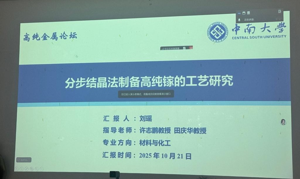 刘瑶同学进行了“分步结晶法制备高纯镓”的主题报告,从研究背景、研究思路、已开展的研究角度出发,分析了下一步工作计划及研究存在问题。校内外专家老师从实验设计、创新表达、论文进度、细节优化等多方面给出建议及指导,核心聚焦研究逻辑梳理与成果完善。