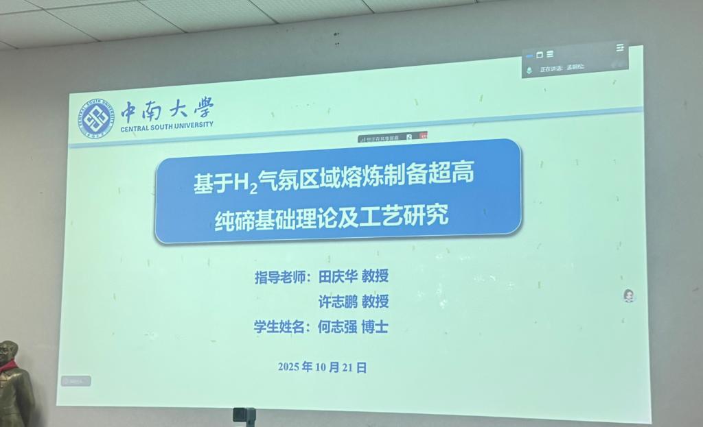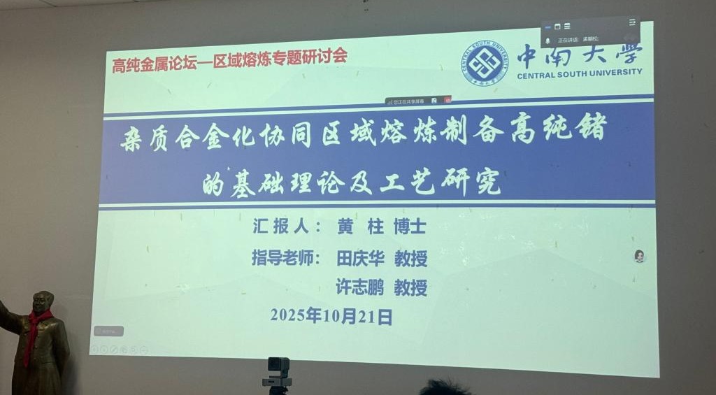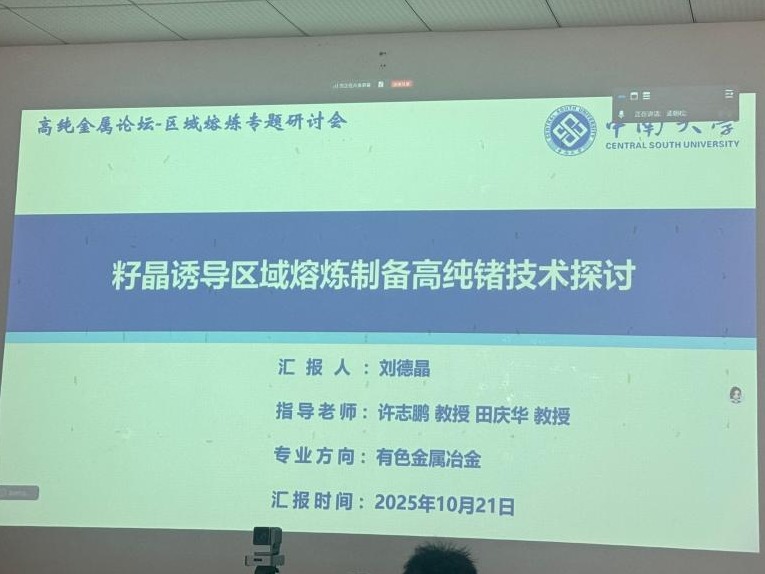 为深入贯彻落实国家科技创新战略,推动新材料领域产学研用协同创新,促进高纯金属材料基础研究与关键技术突破。2025年10月21日,研究院组织举办“高纯金属论坛—区域熔炼专题研讨会”,会议以线上线下相结合的形式举行,邀请了上海交通大学材料科学与工程学院张佼教授、中南大学粉末冶金研究院宋淼教授、昆明理工大学冶金与能源工程学院熊恒教授、中南大学材料科学与工程学院冯艳教授、上海大学材料科学与工程学院张小新副教授、中南大学冶金与环境学院窦坤老师,研究院于大伟教授、辛云涛副教授和乔晋玺博士后9位专家参会指导。会议由许志鹏教授主持,武汉科技大学硕士生张一哲,及高纯金属小组全体学生参会交流。