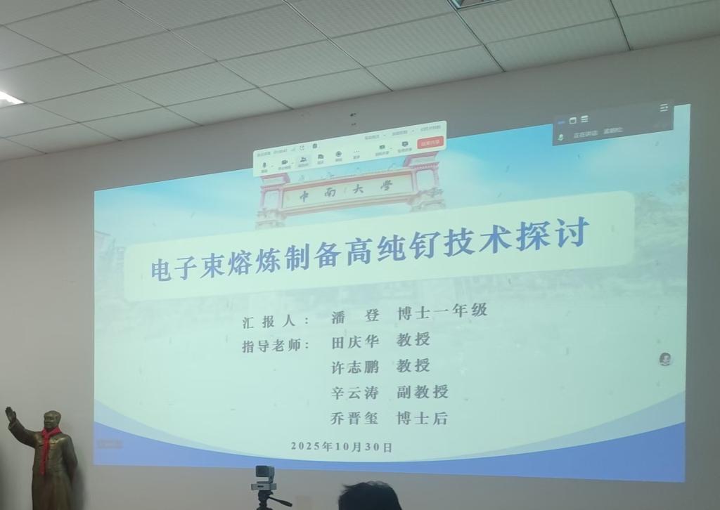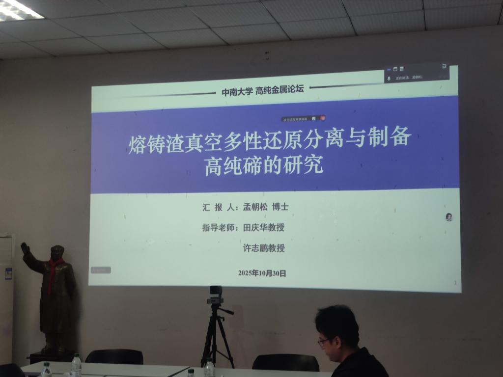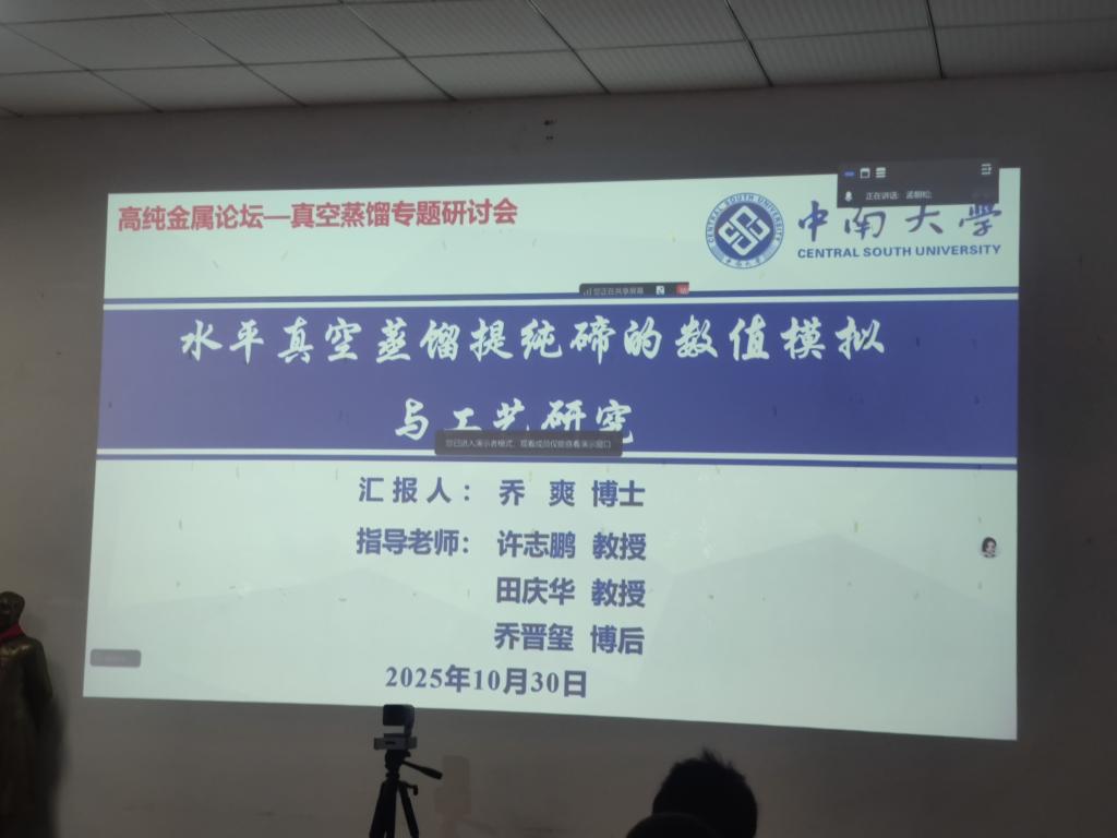 为持续推进高纯金属材料领域的技术创新与学术交流,深化真空蒸馏技术在金属提纯中的基础研究与工艺优化,2025年10月30日,研究院在中南大学资源楼218会议室组织召开了“高纯金属论坛—真空蒸馏专题研讨会”。会议以线上线下相结合的形式举行,特邀昆明理工大学冶金与能源工程学院李一夫教授、董朝望教授,有研资源环境技术研究院(北京)有限公司江洪林正高级工程师,中南大学粉末冶金研究院袁铁锤教授、王章维教授,冶金与环境学院周乐君教授,研究院王松松讲师参与指导。会议由乔晋玺博士后主持,高纯金属组田庆华教授、许志鹏教授、辛云涛副教授及全体学生参会交流。