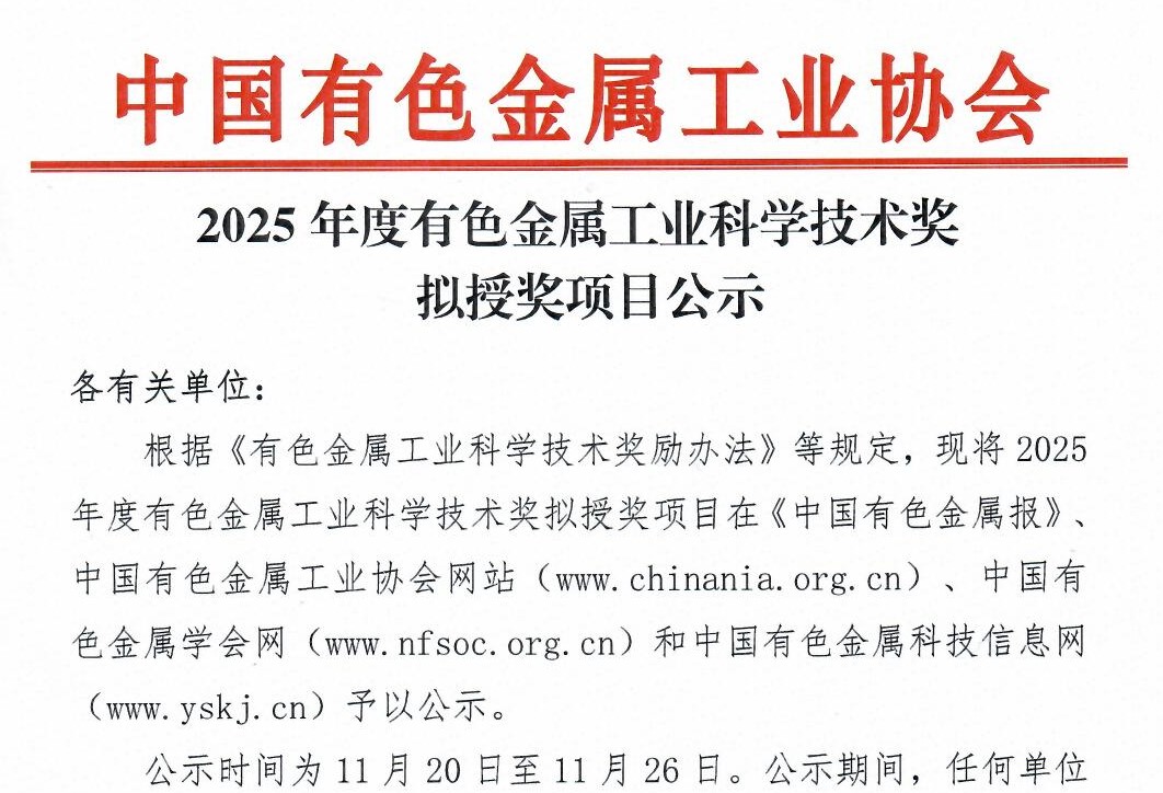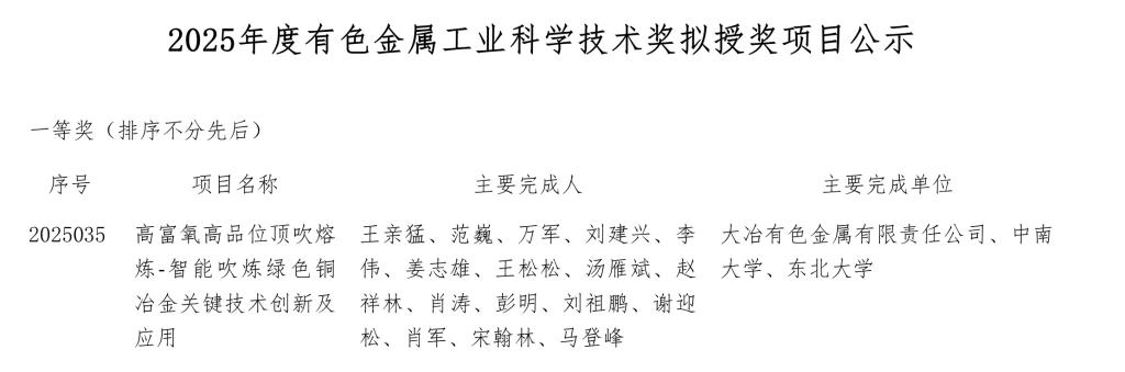 近日,2025年度中国有色金属工业科学技术奖获奖项目正式揭晓,由研究院王亲猛教授主持,联合大冶有色金属有限责任公司、东北大学共同完成的“高富氧高品位顶吹熔炼-智能吹炼绿色铜冶金关键技术创新及应用”获科技一等奖。