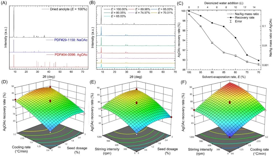 图3 (A)电合成阳极液完全干燥后的固相产物XRD图谱;(B)平衡实验中不同溶剂挥发率(E)条件下固相产物的XRD图谱变化;(C)平衡实验中E 对AgOAc回收率及AgOAc中Na/Ag质量比的影响;(D)~(F)重结晶实验响应曲面图:在E=85% 条件下,冷却速率、晶种加入量与搅拌强度对AgOAc回收率的影响。