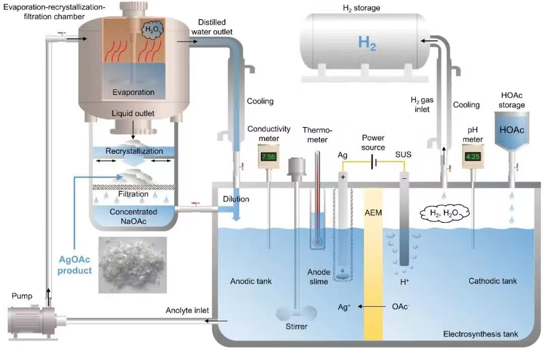 (2)电合成过程中使用的NaOAc电解质可在结晶过程被回收,进而实现循环利用,AgOAc制备过程仅消耗HOAc,副产物H2可带来额外经济效益。