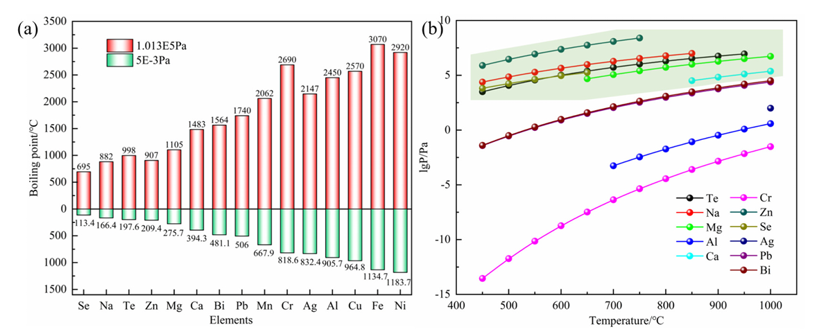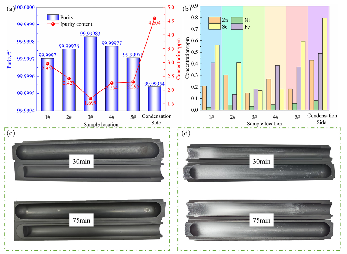 (3) 揭示了易挥发与难挥发杂质的分离机制,系统研究了典型杂质元素(如Se、Zn、Fe、Ni)在短时蒸馏-长时冷凝过程中的迁移与分布行为,为高纯金属的深度净化提供了新的调控策略。