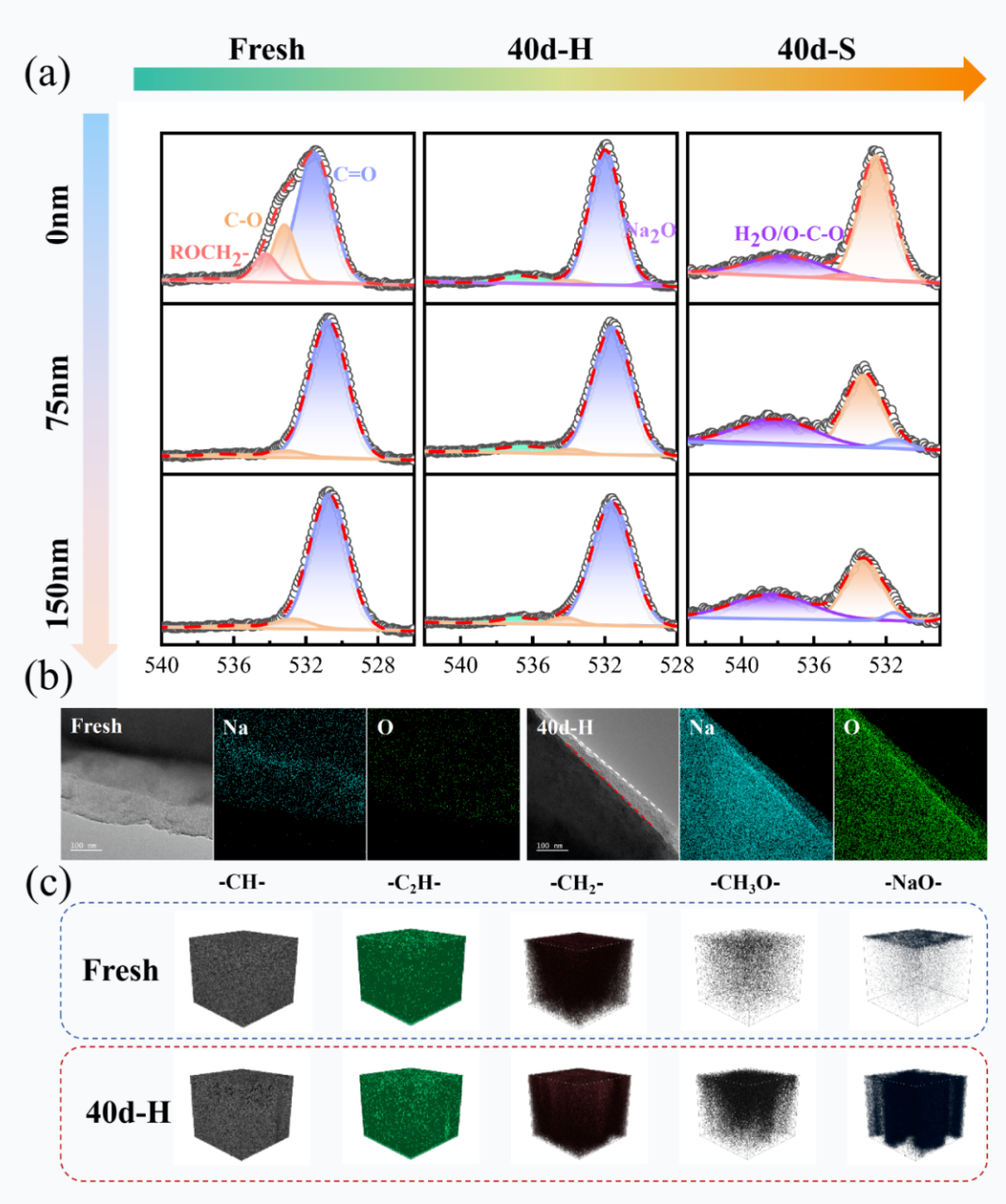 为进一步揭示氧气与水分对硬炭表面结构的影响,将三组材料组装成扣式电池并循环后拆解,取出电极开展深度剖析与显微及质谱表征,以验证水氧与表面碳原子的相互作用机制。深度刻蚀XPS在75 nm与150 nm处对界面进行分层分析。Fresh表面氧主要以C=O与C-O形式存在,并伴随少量ROCH2组分,随刻蚀加深后氧官能团更偏向C=O。相比之下,40d-H在相近深度出现弱Na2O信号,表明界面存在更显著的Na-O键合。与此同时,40d-H与40d-S在537至538 eV附近出现特征峰,主要归因于物理吸附水及部分O-C-O相关官能团,其中40d-S峰更强,反映湿润储存对表面水相关官能团的影响更为突出。进一步的峰拟合结果显示,Fresh电极以C-C为主且仅有少量C-O信号,40d-H表面C-O与C=O增强且随深度衰减,符合表面氧化特征;40d-S则表现为C-C进一步降低,同时O-C-O与含氟碎片信号增强,指示湿润环境下氧化更严重并伴随更强的电解液分解副反应。Na1s方面,Fresh以Na-O为主并有少量Na-C,而40d-H的Na-O峰更强且Na-C减弱,说明富氧表面更倾向形成Na-O键合;40d-S除更强的Na-O外还出现Na-POxFy副产物,表明湿润条件下副反应进一步加剧。显微结果进一步给出直观证据,40d-H电极界面出现明显Na与O富集区域,说明表面含氧官能团可吸附并固定大量Na,形成不可逆钠官能团,从而解释首效与可逆容量下降。TOF-SIMS也检测到40d-H界面CH3O与NaO碎片信号增强,前者表征含氧官能团丰富,后者表征钠与氧在界面形成不可逆结构,两者共同指向环境老化导致界面锁钠增强并引发性能劣化。