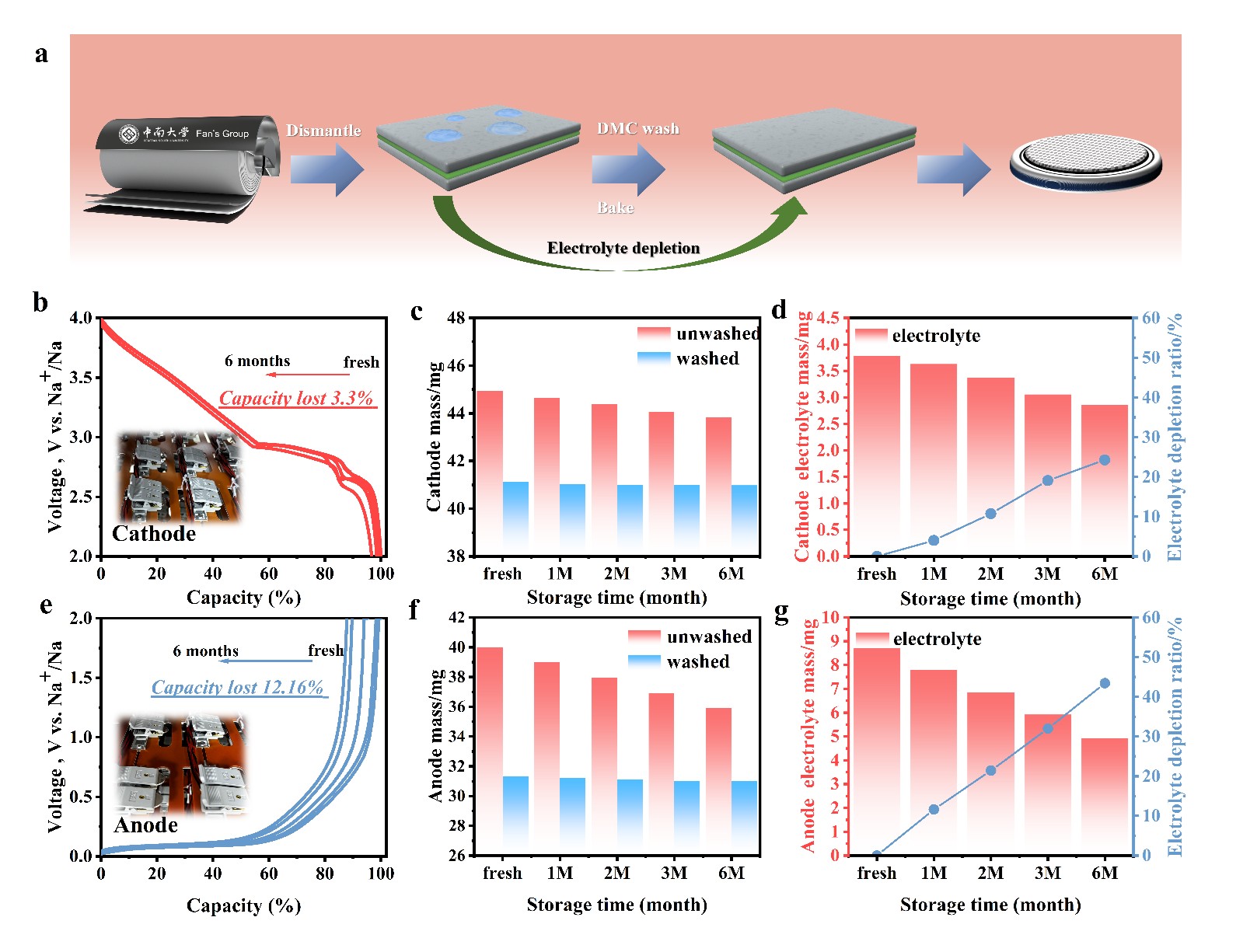 图3 (a)电池拆解过程;(b)-(g) 阴极与阳极容量损失与电解液损耗量