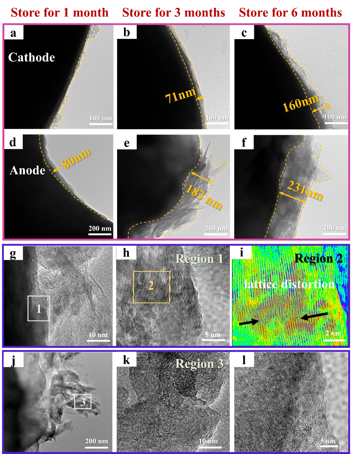 图4 存储1个月、3个月和6个月后阴阳极材料与界面微观表征