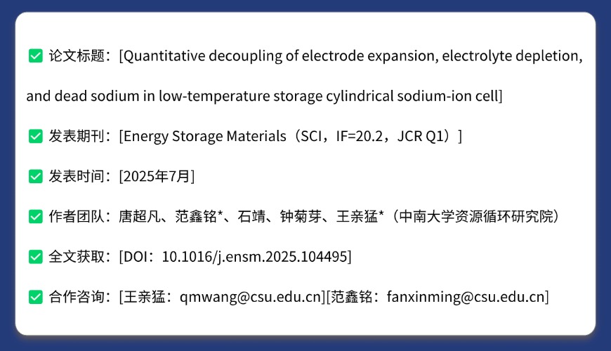 标准引用格式:Tang C, Fan X, Shi J, et al. Quantitative decoupling of electrode expansion, electrolyte depletion, and dead sodium in low-temperature storage cylindrical sodium-ion cell[J]. Energy Storage Materials, 2025: 104495. DOI:10.1016/j.ensm.2025.104495