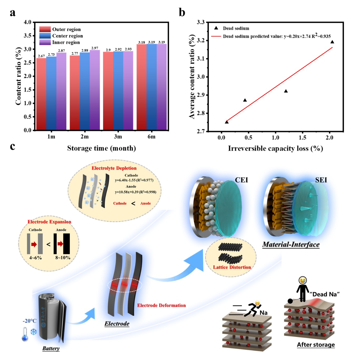 ②揭示了低温存储过程一种新的容量损失演变机制:存储前期(1-3月)由电解液消耗与体系极化引起的可逆容量损失占主导向存储后期(>3月)由界面恶化,死钠积累造成的非可逆容量损失占主导的转变。